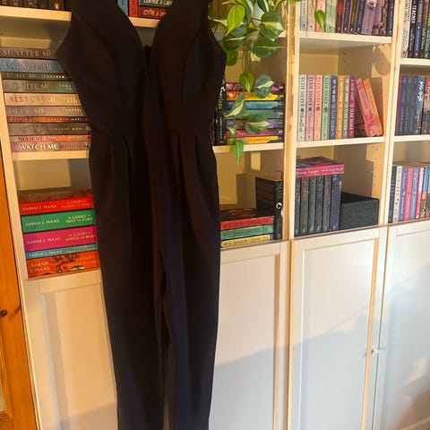 Floyd buksedress for dame i størrelse L. Modellen er helsort med korte ermer og lange ben. Overdelen har blondedetaljer foran og bak, med rund hals og lukking i nakken. Plagget er laget i polyester, som gir et lett og fallende uttrykk. Egnet som penbuksedress til anledninger der man ønsker et enkelt og ensfarget antrekk.