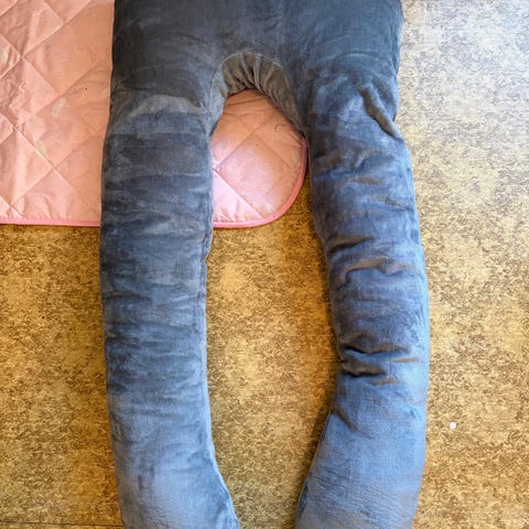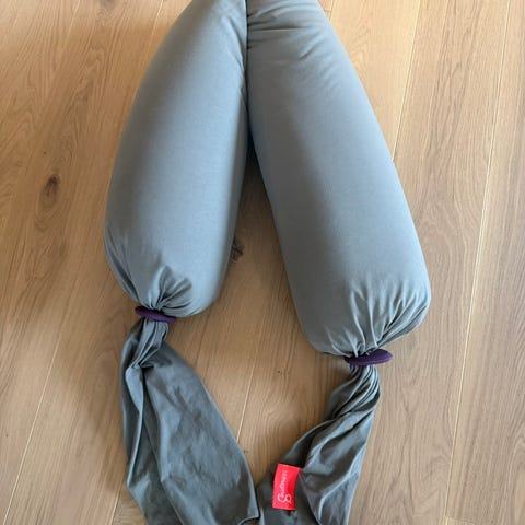 bbhugme gravidpute i grå farge. Puten er formbar og kan justeres etter behov for støtte til kropp under graviditet. Den kan brukes i ulike sovestillinger og som støtte ved sitting eller amming. Trekket er avtagbart og kan vaskes. Leveres med oppbevaringspose.
