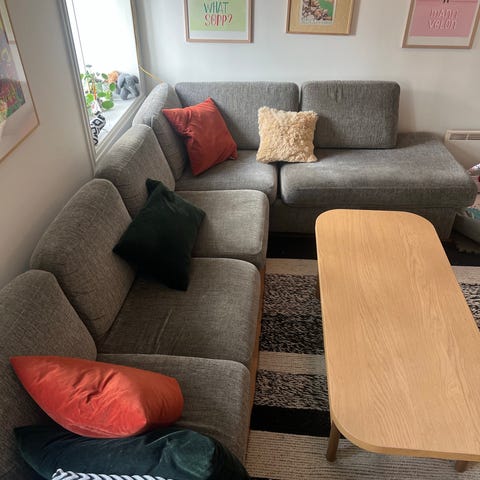 Sofa med sjeselong fra 2013, godt brukt, gis bort mot henting. Vaskbart trekk. Glidelås på ene sittepute er ødelagt (se bilde), dette vises ikke så godt når ryggputen dekker over. God sittekomfort.