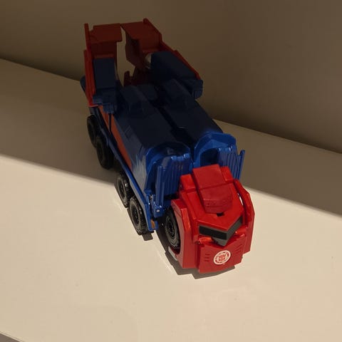 Transformers figursett med tre robotfigurer og én bil. To av robotene er gule og grå med samme utforming, mens den tredje er rød, hvit og blå. Den gule bilen har Transformers-logo på siden og kan forvandles til en liten robotfigur. Settet passer som lekefigurer for barn som liker Transformers-universet, og kan brukes både til lek og som samleobjekter.