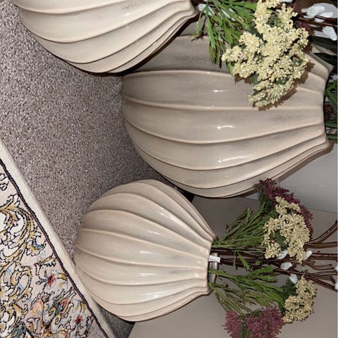 Håndlaget saki vase av steintøy. Kjøpt på Westwing. Ligger uåpnet i esken. Høyde 40cm bredde 32cm.