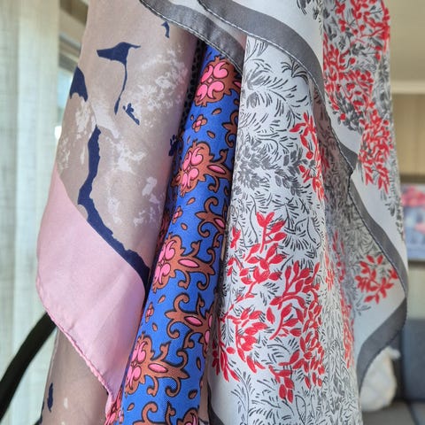 Diverse sjal i forskjellige farger og et varmt skjerf i grått. Alle er pent brukt, noen ikke brukt, syntetiske tekstiler og bomull