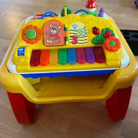 Fisher-Price aktivitetsbord for barn. Bordet har flere innebygde lekeelementer, blant annet tastatur med tallknapper, bok med sider som kan blafres i, roterende og skyvbare deler samt figurer som kan trykkes på. Aktivitetsbordet er fargerikt med blant annet grønn, hvit, blå og oransje plast, og er laget for at små barn kan stå eller støtte seg mot bordet mens de leker. Egnet som lekebord for tidlig læring av motorikk, tall og former.