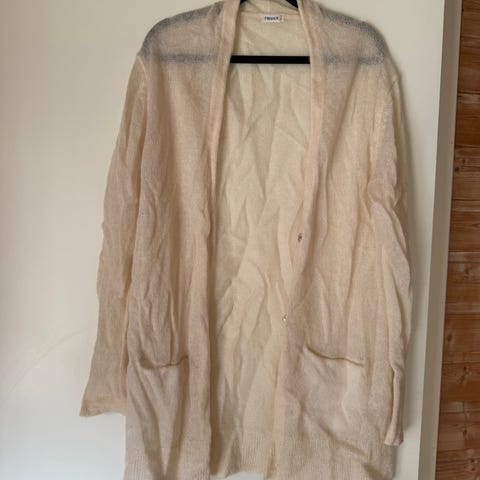 Filippa K cardigan for dame i størrelse L. Lang modell i grå farge med grovstrikket struktur. Jakken har lange ermer, knappelukking foran og lommer i sidene. Passer som et ekstra lag over topper, skjorter eller kjoler i hverdagen eller på jobb.
