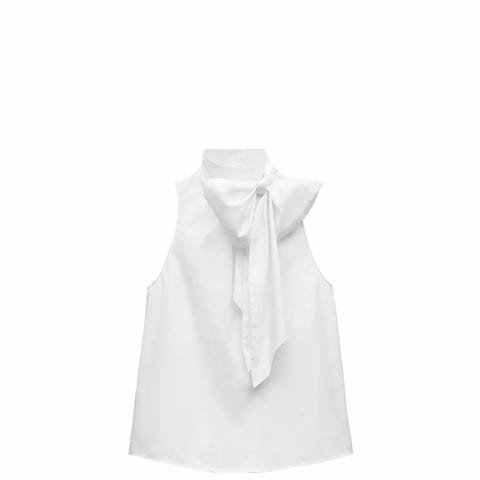 Zara topp for dame i størrelse M. Toppen er hvit og laget av polyester. Den har rund hals, halvlange ermer med lett vid fasong og rett passform. Lukkes med knapp i nakken. Passer til bruk alene eller under jakke eller blazer.