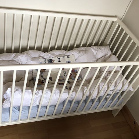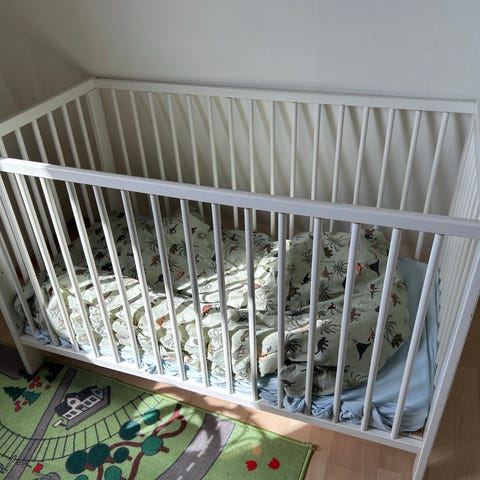 Sprinkelseng i hvitmalt tre. Klassisk modell med rette sprosser på alle sider. Sengen har madrass og sengekant med lyst mønster. Passer til baby og småbarn. Egnet som fast seng på barnerom eller som ekstra seng hos besteforeldre eller i fritidsbolig. Mål og produsent er ikke oppgitt.