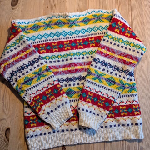 Min mor strikket denne til meg før en fjelltur i Rondane da jeg var 12år. Strikket i gsrn fra Rauma. Jeg elsket fargene! Ser ikke slitt ut. God som ny!