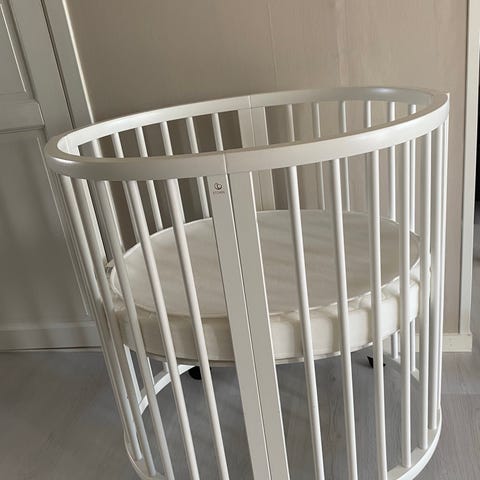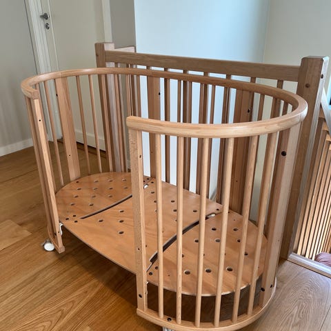 Selger en trefarget Stokke Sleepi mini, med utvidelsessett V2. Inkluderer stang for sengehimmel. Sengen er i god stand, men noen bruksmerker/synlig slitasje her og der, som illustrert på bilde. Hjul til både mini og utvidelsessett medfølger.
