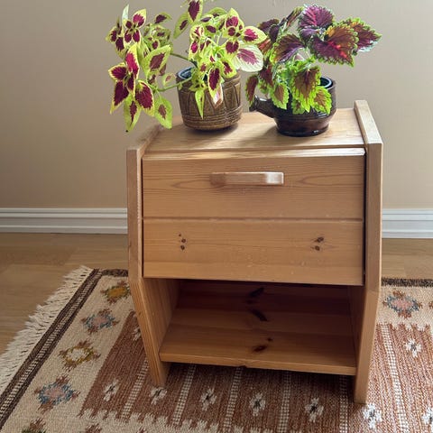 Pent brukt nattbord i heltre furu selges. Praktisk størrelse med to romslige skuffer som glir fint.