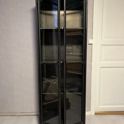 Et veldig fint skap som jeg selv har kjøpt på Finn, men det passer ikke inn i ny stue. Det er mye plass. Til tross for at det ser massivt ut så er det et lett møbel hvor den øverste delen enkelt taes av. Den ene skyvedøren nederst i midten mangler en treplugg (se bilde) Det har ikke så mye å si for bruken så jeg har ikke gjort noe med det, men det er enkelt å sette inn en ny.