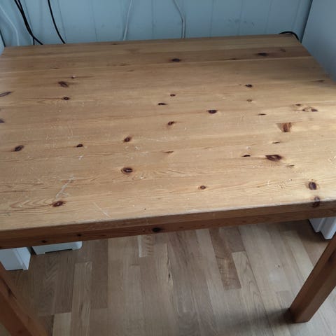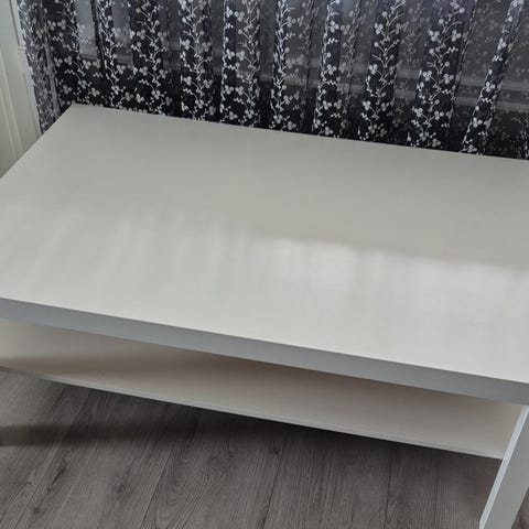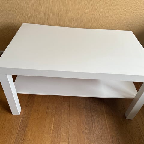 Lack salongbord gis bort. Har ikke målt det, men antar det er på størrelse med https://www.ikea.com/no/no/p/lack-bord-hvit-80449901/ bare at det er kvadratisk. Noen bruksmerker på det, men ellers i grei stand