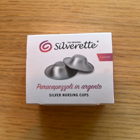 Nesten ubrukte Silverette silver nursing cups i originalemballasje.