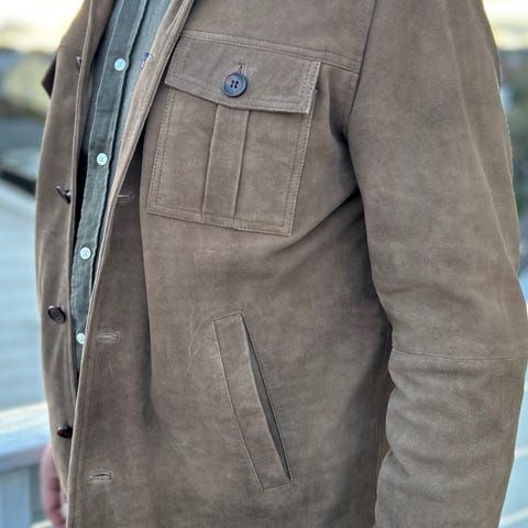 Selger en Ny Serge Pariente Paris Jakke i Semsket Skinn Størrelse L. Merkelapp er tatt av, men den er ny og ubrukt.