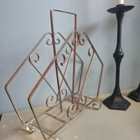 avis- nettbrett- eller magasinholder, et lite plantestativ, eller en kokebokholder