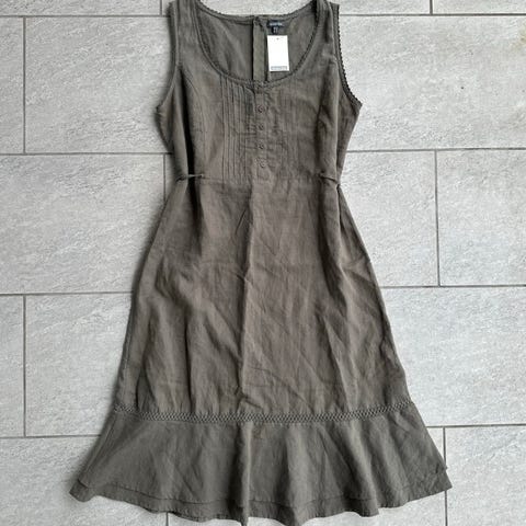 ICHI hverdagskjole i grønn farge, størrelse 42. Skjortekjolemodell med knapper hele veien foran og avtakbart knytebelte i livet. Lange ermer med mansjetter som kan rulles opp og festes. Lengde til ca. midt på leggen (midikjole, ca. 104 cm i str. 36, noe lenger i større størrelser). Kjolen er i vevd materiale med linblanding for en lett og luftig følelse. Egnet som hverdagskjole til bruk både inne og ute i milde sesonger. Brukt 1 gang. Ny pris 799kr.