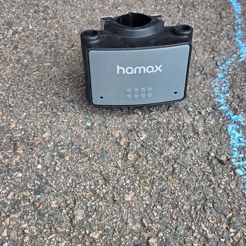 Sykkelbarnsete feste og stag i svart metall. Hamar festen er ødelagt på knappen.Passer til montering av barnesete på sykkel, der stagene festes i setet og braketten rundt