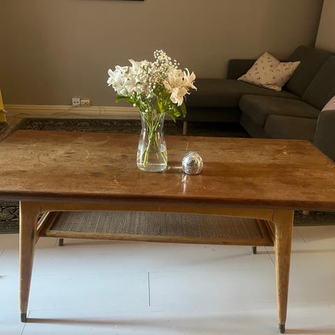 Stort retro salongbord. Lite merker, men kunne trengt å bli pusset.