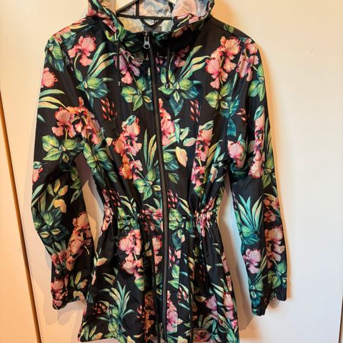 Etage regnjakke for dame i størrelse M. Jakken er laget i polyester og har et flerfarget blomstermønster. Den har hette og glidelåslukking foran. Passer som regntøy til hverdagsbruk og tur i vått vær.