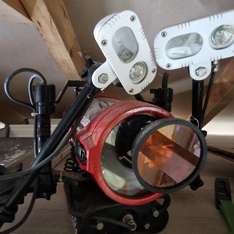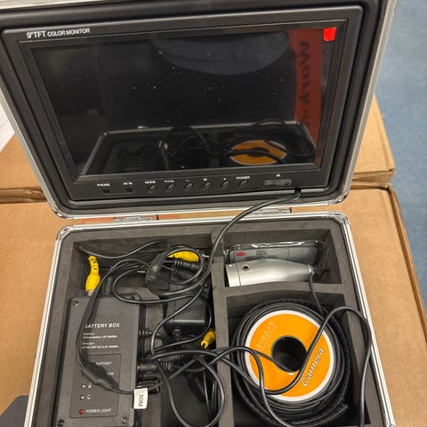 Inspeksjonskamera med integrert skjerm levert i transportkoffert. Settet inkluderer kameraenhet, kabel på snelle, kontrollboks/strømenhet og tilkoblingskabler. Egnet for visuell inspeksjon i rør, hulrom eller andre vanskelig tilgjengelige områder der direkte innsyn ikke er mulig. Skjermen er montert i lokket på kofferten for enkel bruk og oversikt under inspeksjon.