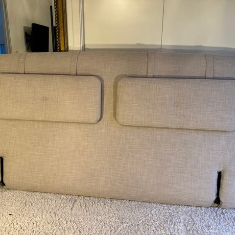 Møbelringen sengegavl i fargen River. Sengegavlen har trukket og knappestoppet front med myk polstring. Rette, enkle kanter gir et nøytralt uttrykk som passer til ulike soveromsstiler. Settes bak seng og fungerer som ryggstøtte og beskyttelse av veggen. Egnet til bruk med standard sengestammer i tilsvarende bredde som gavlen.