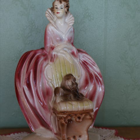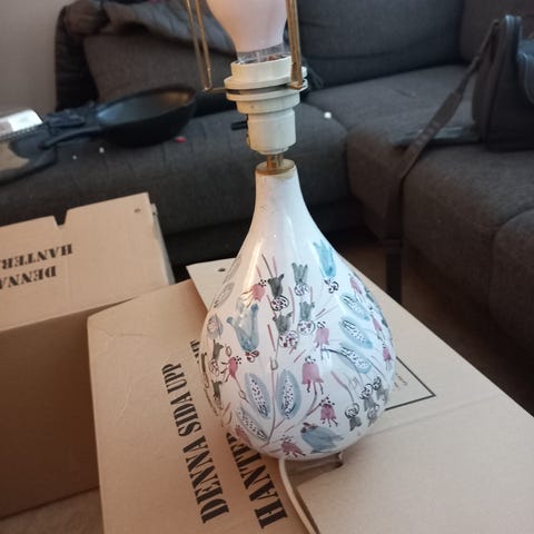 Gammel tysk bordlampe i porselen med lampeskjerm . Høyde med skjerm 35 cm .