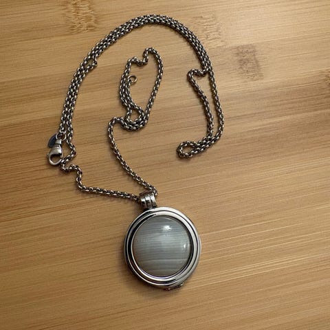 Det anhenget har en fasettslipt stein i gråblå nyanse, festet i en enkel fatning. Kjedet har klassisk lenkedesign og lukkes med karabinlås. Hovedmaterialet er gullbelagt sølv 925.