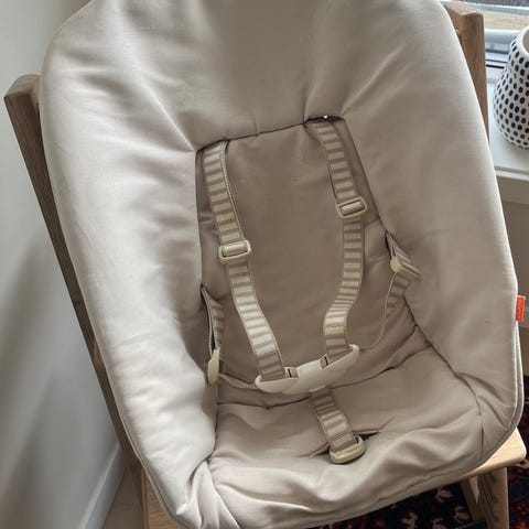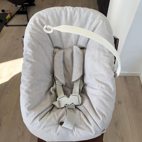 Stokke nyfødtinnlegg med integrert sele. Seteinnlegget har polstret sitteflate og rygg, samt justerbare stropper og låsemekanisme mellom beina for å holde barnet på plass. Passer til bruk i Stokke tripp trapp.