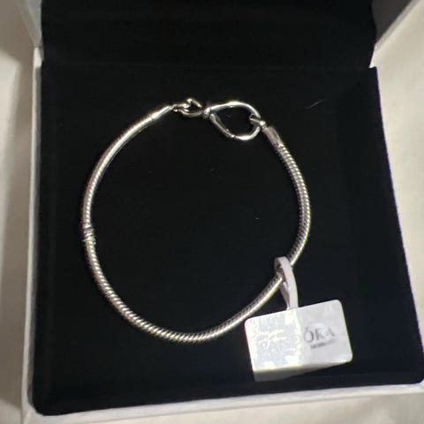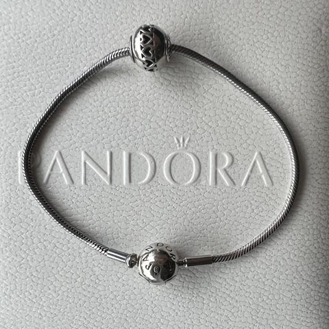 Pandora armbånd i sølv for dame. Armbåndet har justerbar lukking med kule- og skyvemekanisme. Hovedmaterialet er sølv, med enkelte detaljer i andre materialer. Egnet til bruk alene eller sammen med andre smykker. Leveres i eske som vist på bildene, dersom ønskelig.
