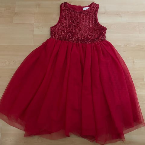 Selger en dyp rød penkjole/julekjole med paljetter og tyll i str. 116. Brukt to ganger.