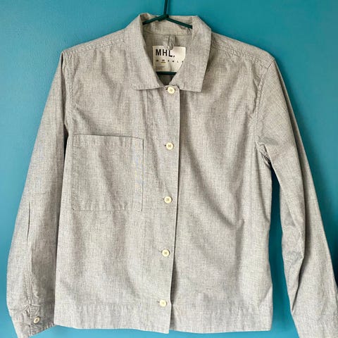 Pent brukt, løs og klassisk MHL skjorte i lyseblå chambray tekstil. Hel og fin.