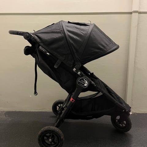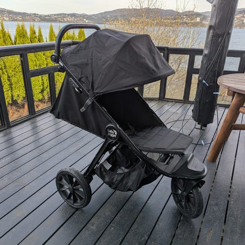 Baby Jogger sportsvogn i svart farge. Vognen har tre hjul med stort forhjul og to bakhjul, justerbar kalesje og fempunktssele i setet. Under vognen er det en oppbevaringskurv.