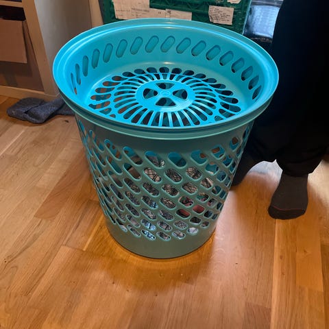 Skittentøyskurv med avtakbar stoffpose i kvit farge og svart metallramme. Kurven har håndtak øverst for enkel flytting. Stoffposen fungerer som innerpose og kan tas ut for tømming eller vask. Det er gammal og godt brukt, men har mykje bruk igjen! Tøyposen treng nok ein vask!