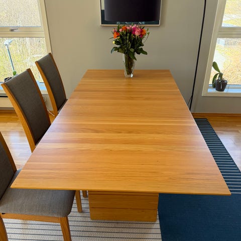 Helt og pent, men stolsetene må trekkes om! Mål spisebord