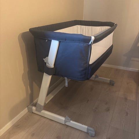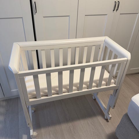 JLY bedside crib barneseng i hvit farge. Sengen er kjøpt brukt. Høyden kan justeres for å tilpasses voksenseng. Vi har borret to ekstra hull i siden på sengen, dette gjør at man kan la sideveggen stå i et mellomnivå, se bilder. Før kunne den bare stå enten helt oppe eller helt nede.