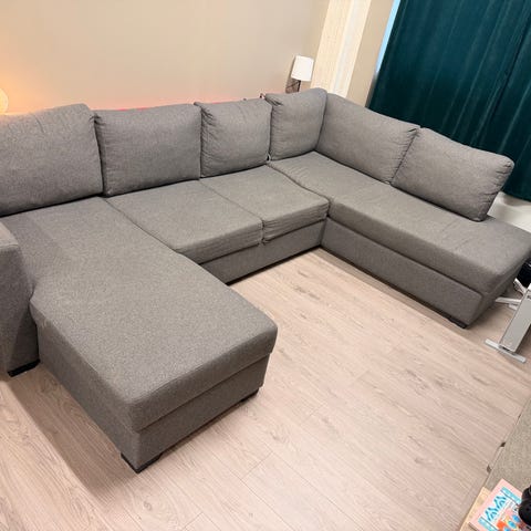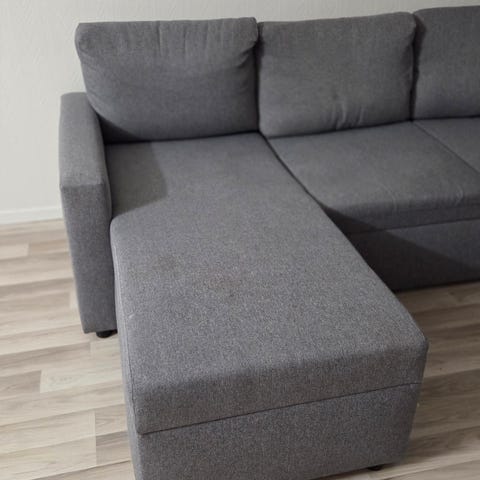 Skeidar hjørnesofa i grå tekstil. Sofaen har rette linjer, løse ryggputer og faste seteputer. Trekk i vevd stoff og lave, mørke ben. Passer som sittegruppe i stue eller TV-rom, med god plass til flere personer langs begge sider av hjørnet. Dette er en pent brukt sovesofa kjøpt på Skeidar i sin tid. Den er renset og fremstår som meget pen. Kan være at man må sette inn en spiker eller skrue under der sovesofa-delen dras ut.