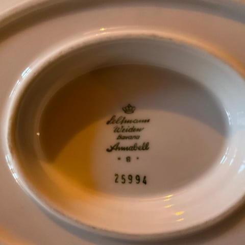 Rosenthal Helena servise i hvitt porselen med gullkant. Serviset består av ulike deler, blant annet middagstallerkener, asjetter, kopper med skåler, serveringsfat og skåler. Klassisk design med rektangulære og runde former og dekor i gull langs kantene. Middagsservice. Merket Rosenthal Helena Germany under delene. I god stand, ingen synlige skår.