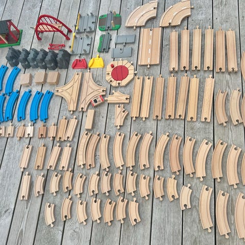 BRIO togbane i tre med flere tog og tilbehør. Settet inneholder ulike rette og buede skinneelementer i tre, samt broer og mindre tilbehør som kan brukes til å bygge ulike baner. Det følger med flere lokomotiver og togvogner i forskjellige farger og utforminger, inkludert batteridrevne tog og klassiske trevogner. Togbanen er egnet for lek på gulv og kan kombineres med andre BRIO-togbanesett i tre.