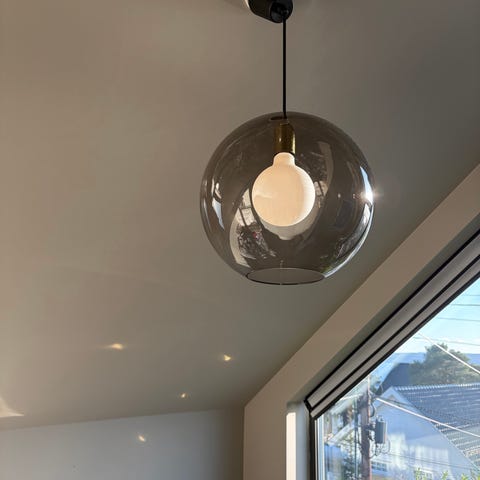 Selger en stilren og moderne pendellampe i røykfarget glass. Gir et behagelig og stemningsfullt lys – perfekt over spisebord, i gang eller ved vindu.