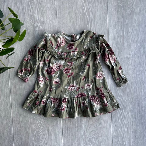 Newbie kjole i størrelse 80. Kjolen er i hvit bomull med blomsterprint og korte ermer. Den har volangkant nederst og trykknapper bak for enklere av- og påkledning. Kjøpt ny av meg og kun brukt et par ganger, fremstår som ny.