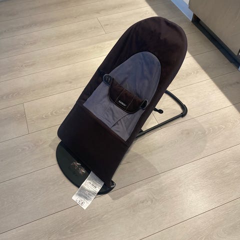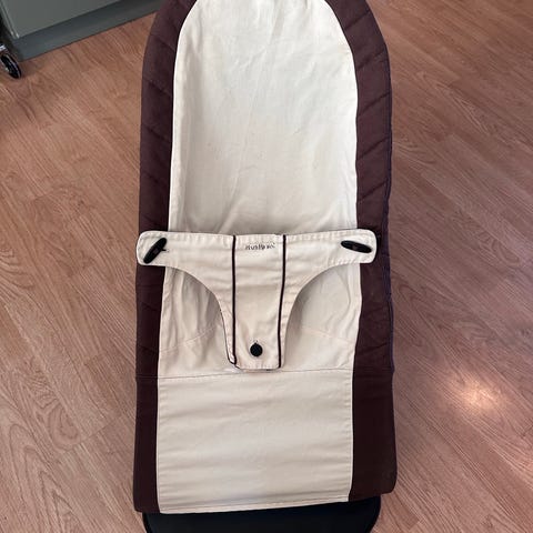 Babybjörn barnestol i form av en vippestol i fargene svart og hvit. Med nyvasket trekk som kan brukes på begge sider. Kommer fra hjem uten dyr eller røyk.