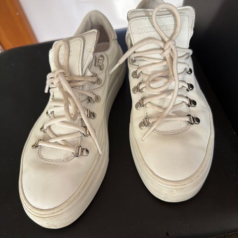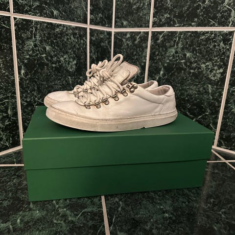 Diemme Marostica Low sneakers i størrelse 42. Modellen er en lav joggesko med snøring og metallhemper. Skoene er i en lys beige farge, med kraftige lisser og polstret kant rundt ankelen for økt komfort. Yttersålen er flat og gir godt grep til hverdagsbruk. Leveres med original eske og ekstra lisser, samt stoffpose fra Diemme, egnet til oppbevaring av skoene. Passer som fritidssko og til daglig bruk.