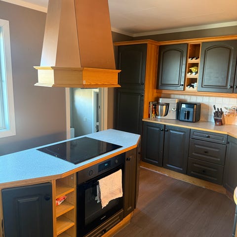 Kjøkkeninnredning med benkeplate, overskap, underskap og integrerte hvitevarer i grå utførelse fra Ikea-budbin. Innredningen består av flere underskap med skuffer og skapdører, samt høye overskap med profilerte fronter. Benkeplaten er lys med mønster, og det er montert vask med to kummer og kjøkkenarmatur i metall. Over benkeplaten er det montert lys og en lys veggplate med marmormønster som fungerer som sprutbeskyttelse. Kjøkkenet har integrert platetopp og stekeovn, samt integrert mikrobølgeovn i overskap. Det er plass til kjøleskap i enden av innredningen, og det er en forlengelse av benkeplaten som kan brukes som spise- eller arbeidsplass, kjøkkenet er tilpasset en rett kjøkkenløsning. Kjøleskap følger ikke med. Belysning under skap over vask følger med, og ventilator. Lengden på den med vask er 3.20, på don't n Andre siden Er 4m