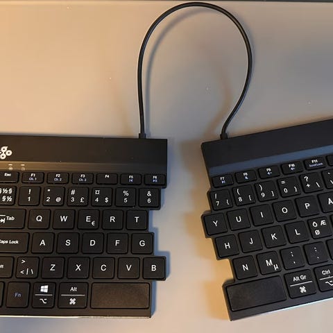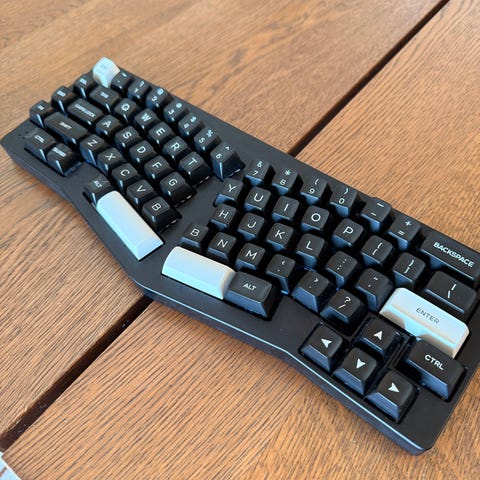 Delt ergonomisk tastatur i svart farge, brown switches.