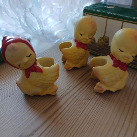 2 stk eggeglass fra firkløveren. Dessverre har de noen mangler som vist på bildet.men fortsatt brukbare.selges samlet for 350