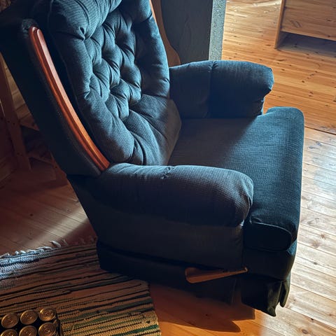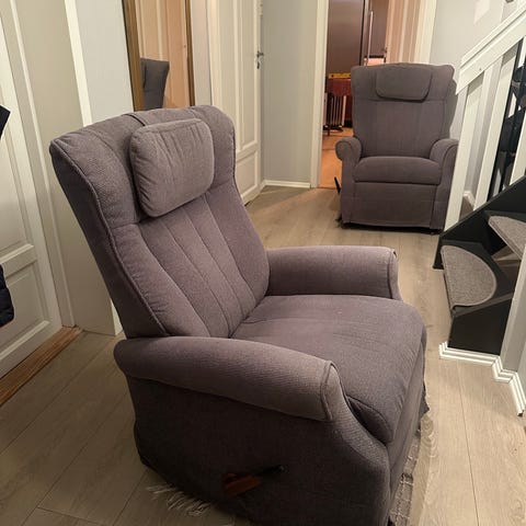 To svarte godt brukte lenestoler gis bort. Noen rifter, som har blitt tapet og kun ene stolen som kan ta ut fotskammel. Veldig gode å sitte i. Store og tunge. Må hentes!