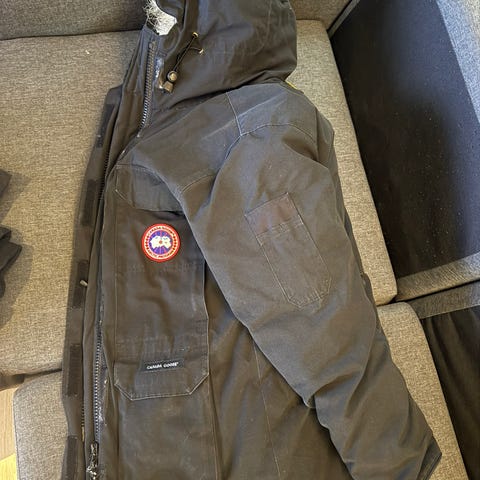 Canada Goose-jakke (Burnaby Chore Coat) for herre i størrelse M. Jakken er svart og laget i polyester. Den har klassisk krage, glidelås og knappelukking i front, samt flere frontlommer. Canada Goose-logo på ermet. Jakken egner seg som ytterjakke i hverdagen og til bruk utendørs i mildere værforhold.
