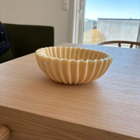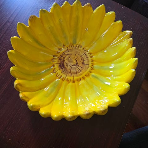 Lagerhaus Flower brett i gul farge. Brettet er formet som en blomst og har målene ca. 25 x 25 cm. Egnet til servering eller som dekorasjonsbrett. Merket med symboler for håndvask og at det ikke skal brukes i mikrobølgeovn.