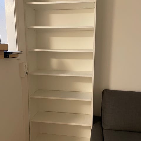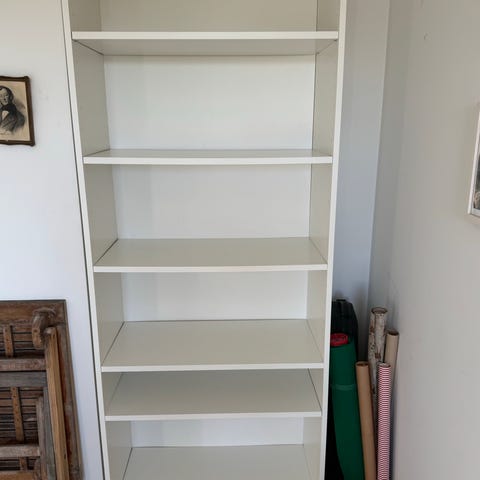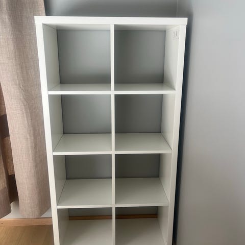 Bokhylle fra IKEA selges grunnet flytting. Man kan justere hyllene slik man ønsker. Noe slitasjemerker, men ikke påfallende (se bilde).