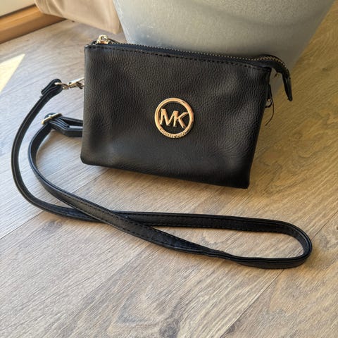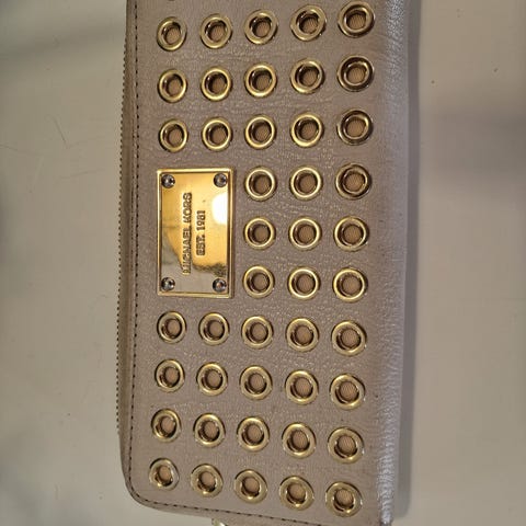Lommeboken på bildet er en liten konvoluttformet kortholder eller lommebok fra Michael Kors. Den kjennetegnes av det klassiske "MK"-monogrammet på utsiden, kombinert med glatt skinn og en logo i gullfarge på innsiden.