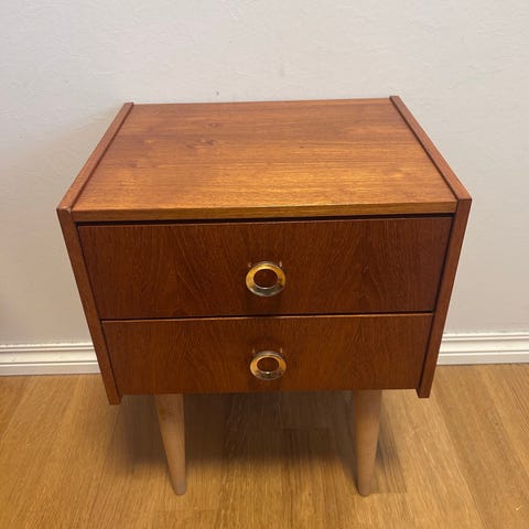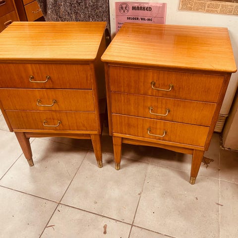Pent brukte nattbord i teak. Høyde 55 cm, bredde 40 cm og dybde 33 cm.